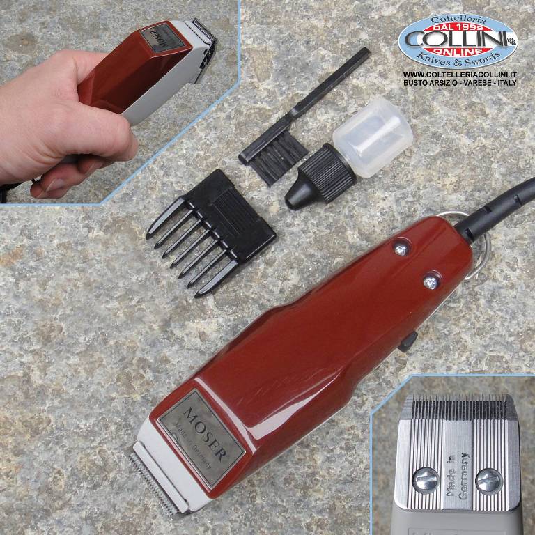 TECHNICAL DATA TYPE Professional Mains-Operated Hair Clipper BLADE SET Stainless steel blade set STAR BLADE QUICK-CHANGE BLADE SET – TOP BLADE WIDTH 46 mm CUTTING LENGTH 0,1 – 3 mm TYPE OF OPERATION Corded DRIVE Oscillating armature motor, approx. 6000 rpm SPEED CONTROL – OPERATING VOLTAGE Max. 10 W / 230 V, 50 Hz OUTPUT max. 10 W CABLE 2 m ACOUSTIC INFORMATION SYSTEM – DIMENSIONS 175x69x50 mm WEIGHT 520 g ART. NO. 1400-0050 PACKAGE INCLUDING: MOSER 1400 Classic Professional Hair Trimmer Clipper 220-240V **New** 1 attachment comb 4.5 mm cleaning brush oil Voltage Transformer 220v to 110V